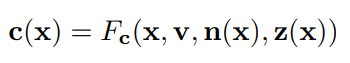 빛 방사 함수를 근사하기 위해, 외관 모델은 점 x, 뷰 방향 v, 법선 n(x) 및 geometry feature z(x)를 입력 및 출력 색상 c(x)로 취한다.