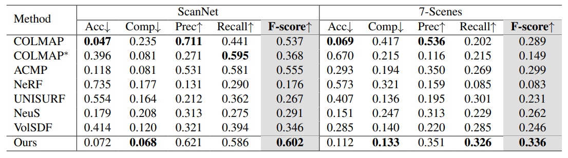 COLMAP*와 ACMP는 COLMAP보다 먼저 평면을 적용하여 일부 누락된 영역을 완료하고 더 높은 리콜을 달성할 수 있다. 그러나 이들의 최적화 전략은 추정된 깊이 맵의 일관성을 보장할 수 없어 노이즈가 많은 재구성을 초래한다.