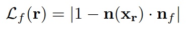 xr은 카메라 광선 r의 표면 교차점, n(xr)은 xr에서의 SD d(x)의 기울기로 계산된 법선, nf는 바닥의 법선 방향을 나타내는 단위벡터 <0,0,1>.