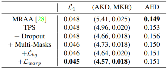 - 폐색 마스크의 면적이 증가하여 모션 전송이 네트워크의 인페인팅 기능에 너무 의존하게 되며, 이는 네트워크의 부적절한 인페인팅 능력으로 이어진다.