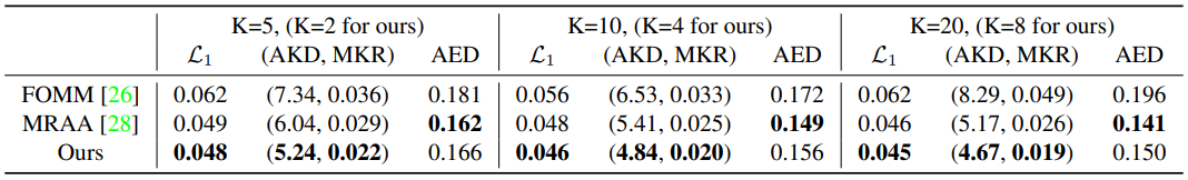 다중해상도 마스크는 L1과 AED는 개선되지만 키포인트 관련 메트릭에서는 손해를 불러왔다.