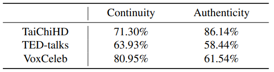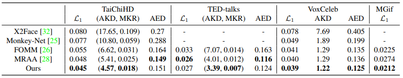 Dataset : VoxCeleb, Taichi HD, TED-talks, MGif