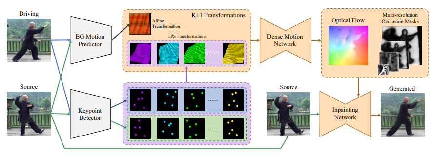 Monkey-Net : 여러 쌍의 비지도 키포인트 쌍을 예측하여 애니메이션을 위한 optical flow를 추정한다.