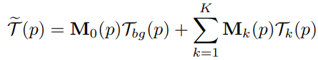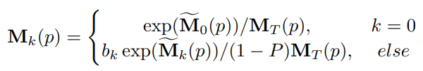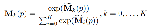 그런 다음 K+1개의 매핑 T로 S를 cascade(순차 적용)하고 Dense Motion Network의 입력으로 사용한다(순차 적용된 각각의 i 번째 이미지들을 다 넘기는 듯?). Dense Motion Network에서는 K+1개의 기여 맵 M̃k를 예측하고 softmax를 통해 모든 기여 맵의 같은 픽셀위치 p에서의 합이 1이 되도록 한다.