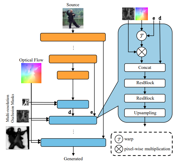 Dense Motion Network에서 레이어마다 추가적으로 컨볼루션을 사용하여 다중해상도 폐색 마스크를 예측하고, optical flow와 폐색 마스크를 Inpainting Network에 공급한다.