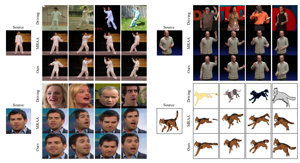 본 논문의 방법은 말하는 얼굴, 인체, 픽셀 애니메이션을 포함한 다양한 물체를 애니메이션으로 만들 수 있다. 실험은 이 방법이 동작 관련 메트릭의 가시적인 개선을 통해 대부분의 벤치마크에서 SOTA보다 더 나은 성능을 발휘한다는 것을 보여준다.