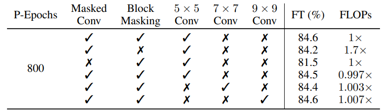 Masked Conv와 Block Masking은 확실히 효과가 있으며,