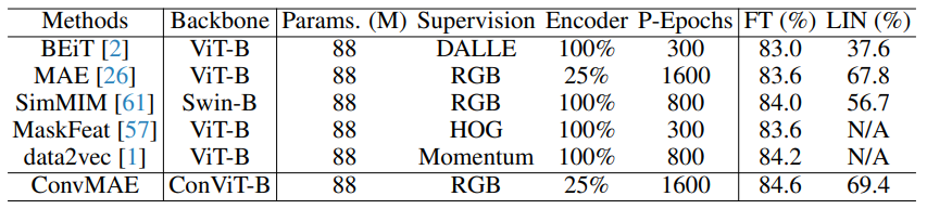 ConvMAE 인코더로 다양한 hybrid convolution-transformer 백본을 시험했지만 큰 성능 개선이 없었기 때문에 새로운 아키텍처를 설계하는 대신 기본 hybrid convolution-transformer 아키텍처가 마스크 오토인코딩을 위해 작동하도록 하는 데 중점을 두고 다양한 다운스트림 작업에 대한 효과를 입증하기 위해 광범위한 실험을 수행한다.