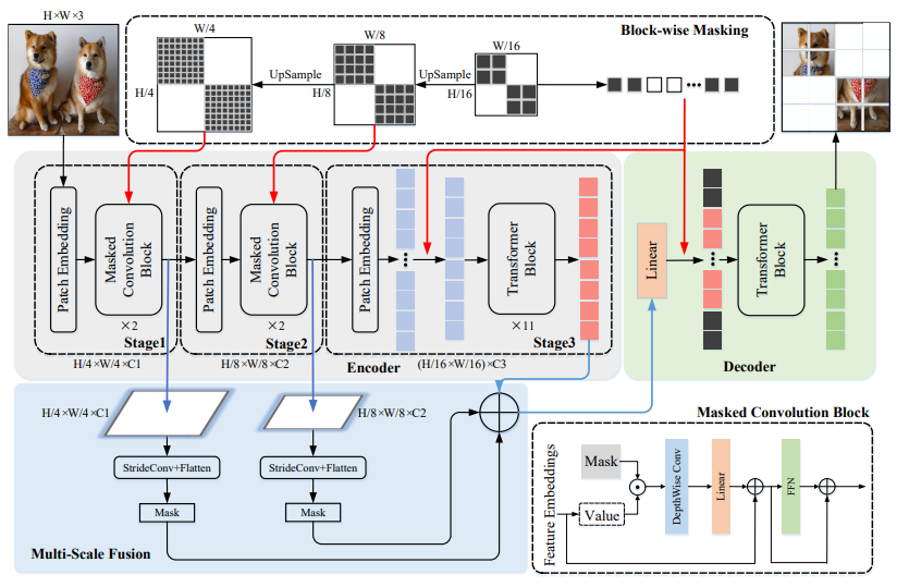ConvMAE의 인코더는 MAE와 달리 입력 이미지를 1,2,3 단계에서 각각 다른 입력 해상도의 다중 스케일 토큰 임베딩으로 점진적으로 추상화하고, 디코더는 다중 스케일 토큰 임베딩을 활용하여 마스크된 토큰에 해당하는 픽셀을 재구성한다. 1단계와 2단계에서의 저수준의 고해상도 토큰 임베딩의 경우 로컬 정보를 인코딩하기 위해 컨볼루션 블록을 채택하고 3단계에서의 고수준 저해상도 토큰 임베딩의 경우 트랜스포머 블록이 사용된다. 따라서 인코더는 서로 다른 단계에서 로컬/글로벌 FOV(field of view)를 가지며 차별적인 다중 스케일 기능을 생성한다.
