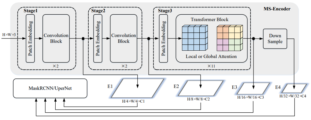 3단계에는 과도한 계산 비용이 드는 11개의 global self attention 계층이 있으므로 Benchmarking ViT에 따라 1,4,7,11번째 self attention 계층을 Swin Transformer의 shifted window local self attention으로 교체한다.