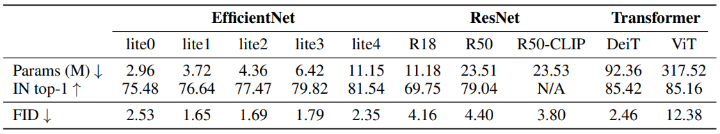 다음은 LSUN-Church 데이터 세트에서 EfficienttNet, ResNet의 각각의 버전을 사전 훈련 네트워크로 사용했을 때의 결과이다. 놀랍게도, 사전 훈련 네트워크로써의 성능은 ImageNet에서의 결과와 관련이 전혀 없었으며, 가볍고 성능이 좋은 EfficientNet-lite1을 기본으로 설정했다.