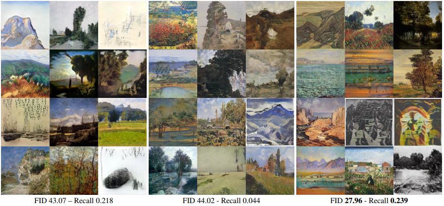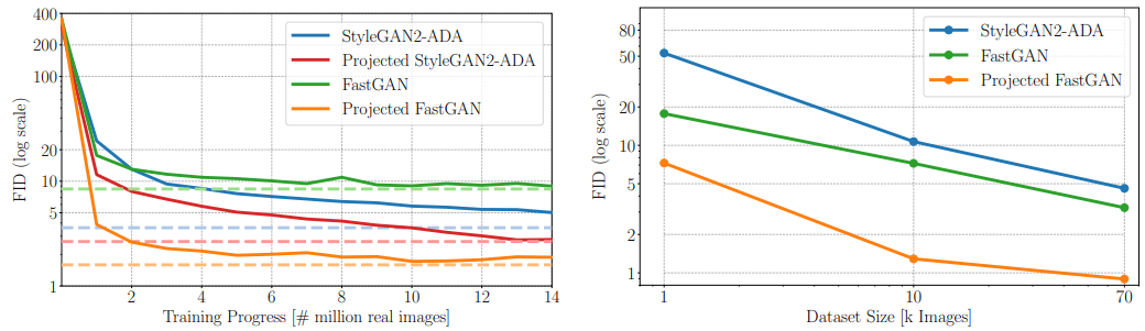 FastGAN이 데이터 효율성에 강점이 있기 때문에 큰 데이터 세트에서보다 훨씬 더 큰 성능 격차를 보인다.