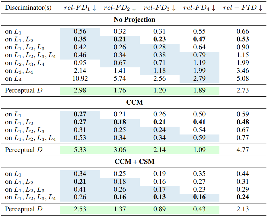 Projected GAN은 가장 빨리 제대로된 형태를 갖춘다. 하지만 다른 모델에 비해 훈련 도중 많은 지각적 변화를 겪는데, 연구진은 이러한 변동성이 기존의 RGB 손실보다 더 많은 의미론적 피드백을 제공하는 다중 판별기 때문일 수 있다고 가정한다. 이러한 의미론적 피드백은 훈련 중에 더 많은 확률성을 도입하여 수렴과 성능을 향상할 수 있다.
