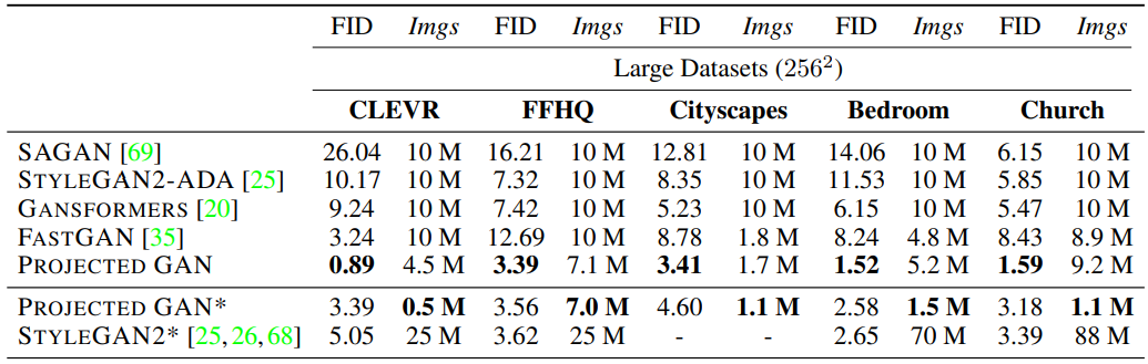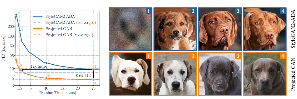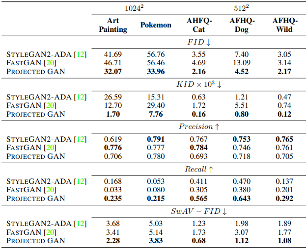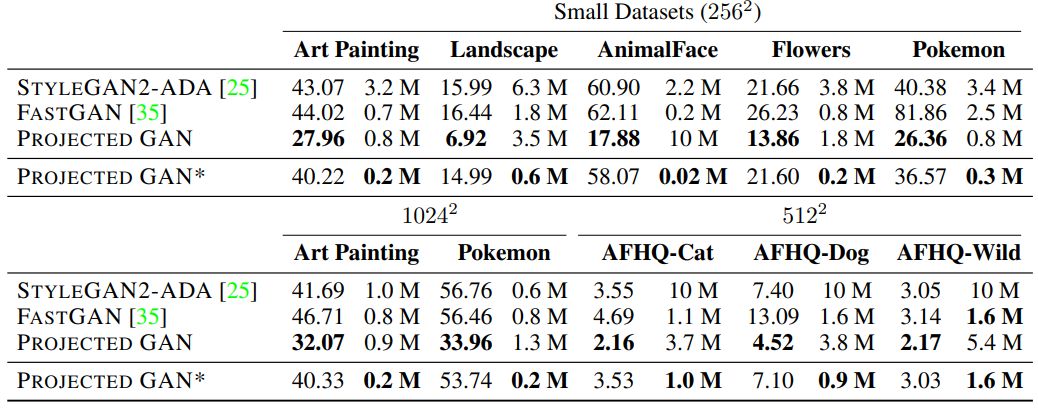 FastGAN과 Projected GAN이 수렴속도가 훨씬 빠르다는 것을 감안해서 보길 바람.