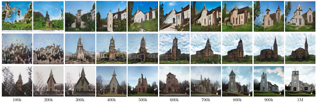 다음은 위에서부터 FastGAN, StyleGAN2, Projected GAN에서 고정 벡터 z를 훈련 경과에 따라 샘플링한 결과이다.