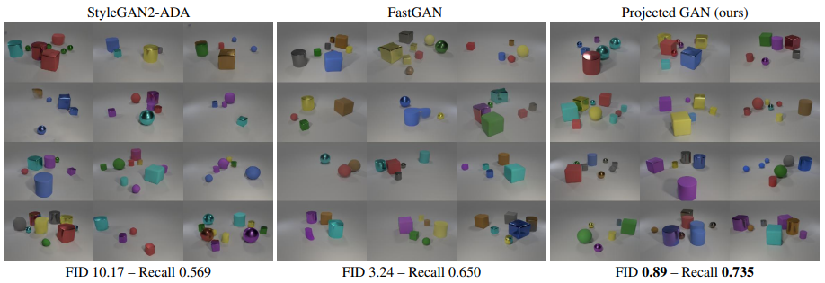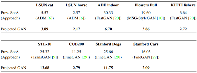 Projected GAN은 모든 데이터 세트에서 낮은 FID를 달성하는 동시에 두 가지 실패 사례도 식별한다.