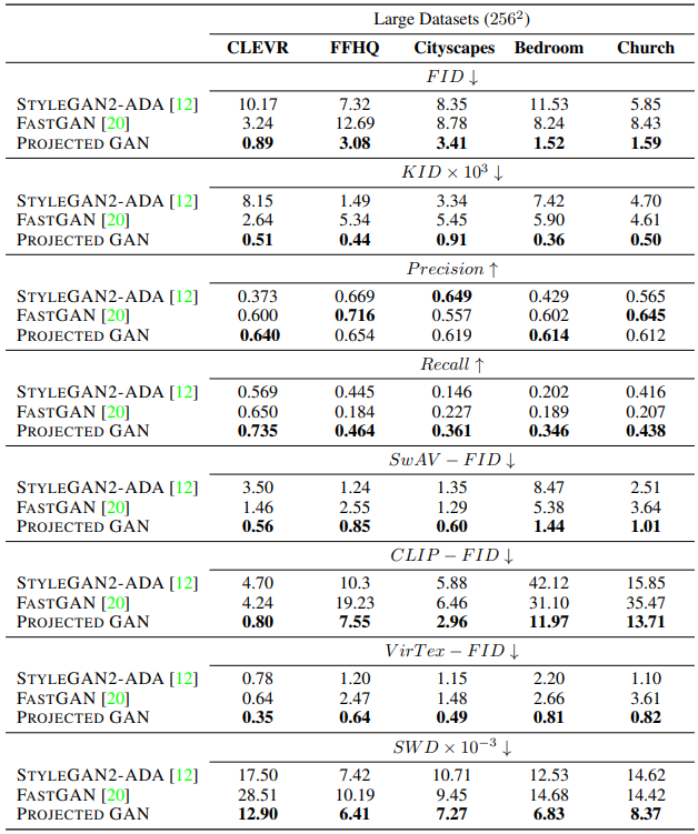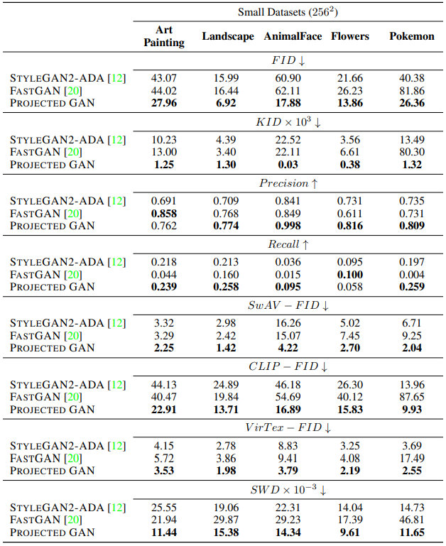또한 최대 10242 픽셀의 해상도로 작고 큰 데이터 세트에 대해 광범위한 실험을 수행한다. 모든 데이터 세트에서, Projected GAN은 훈련 시간이 크게 단축된 SOTA 이미지 합성 결과를 보여준다. 또한 Projected GAN이 데이터 효율성을 높이고 추가적인 정규화의 필요성을 제거하여 값비싼 하이퍼피라미터 sweep가 불필요하다는 것을 알게 되었다.