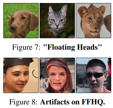 때때로 떠 있는 머리가 관찰되며 눈에 띄는 물체가 이미 묘사되어 있을 때 현실적인 배경과 이미지 구성을 생성하는 것이 덜 중요하게 고려되는 것 같다. 이 가설은 투영을 위해 이미지 분류 모델을 사용했다는 사실에 따른 것이다. 또한 FFHQ에서 Projected GAN은 때때로 SOTA FID에서도 잘못된 비율과 아티팩트로 품질이 낮은 샘플을 생성한다.