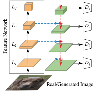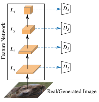 사전 훈련된 feature 네트워크 F(자세한 정보는 ablation 절에서.)의 4개 계층(L1, L2, L3, L4)에서 각각 다른 해상도의 feature를 얻는다. 그리고 각 Ll 계층의 feature와 별도의 판별기 Dl을 연결한다. Dl은 각 컨볼루션 계층에서 스펙트럼 정규화를 갖는 간단한 컨볼루션 아키텍처를 사용한다. 모든 판별기에서 동일한 해상도의 logit을 출력할 경우 더 나은 성능을 관찰했기 때문에 높은 해상도의 판별기에서 더 많은 다운샘플링을 사용한다. 그러고 나서 모든 판별기의 logit을 합친다.
