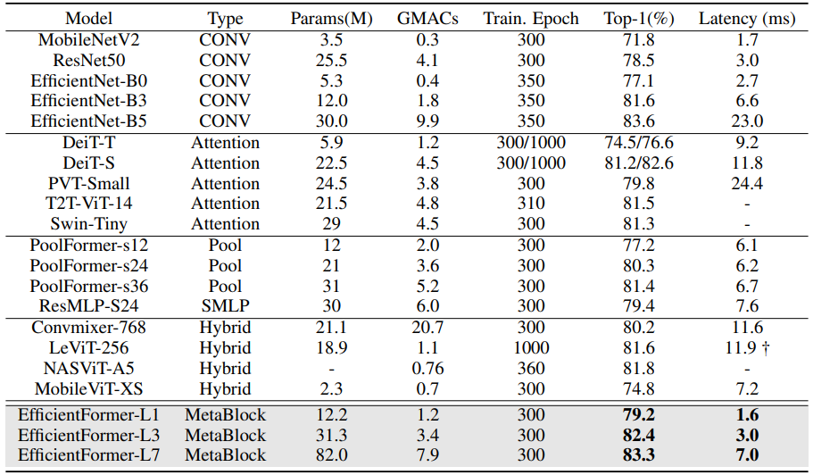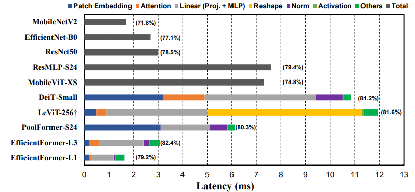EfficientFormer는 Mobilenet 아키텍처를 통합하지 않은 transformer 기반 모델이다.