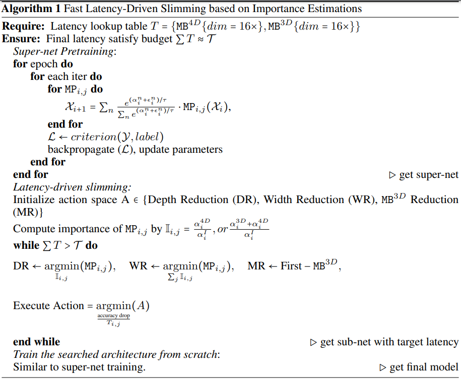 그다음 각각의 서로 다른 폭(=채널, 16의 배수)을 가진 4D, 3D MB의 지연 시간을 수집하여 lookup table을 만든 후 그것을 이용하여 네트워크 slimming을 수행한다.