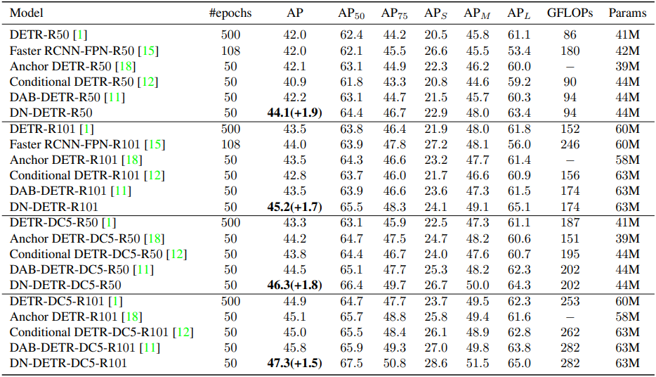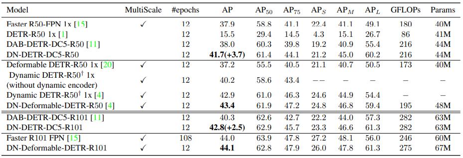 DAB-DETR에 따라 4D 앵커 상자를 사용하며, 성능은 현저한 개선을 보여준다. 또한 다른 DETR 유사 모델에 쉽게 통합될 수 있다.