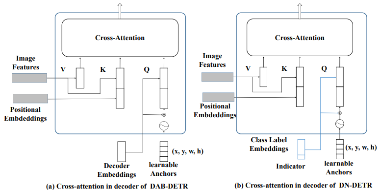 DAB-DETR에서는 쿼리를 4D앵커(x,y,w,h)로 공식화한다. 또한 각 좌표들은 계층별로 동적으로 업데이트된다. 본 논문에서는 DAB-DETR을 거의 수정하지 않고 디코더 임베딩을 레이블 임베딩으로 지정하는 최소한의 수정만 추가한다.