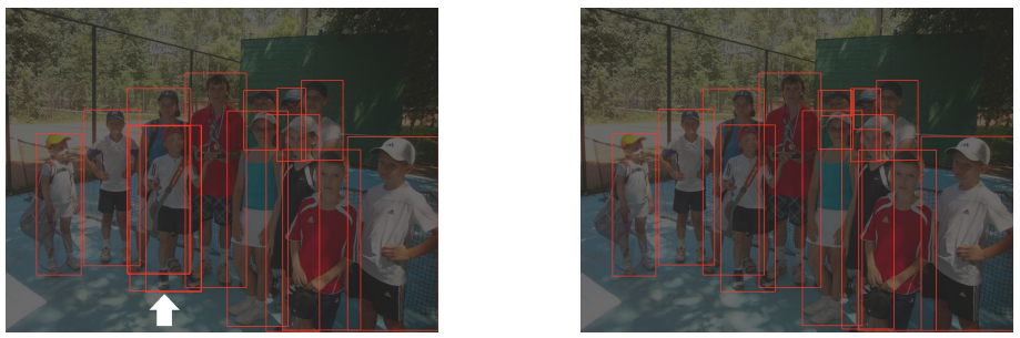 휜색 화살표의 소년은 DN-DETR에서 여러 개의 중복 상자를 가지고 있지만 DINO에서는 그렇지 않다.
