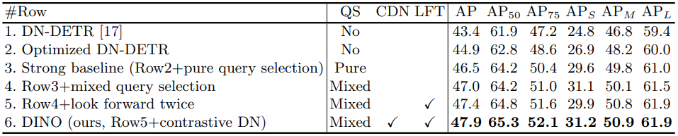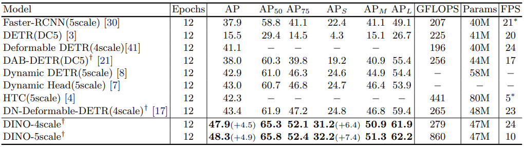 Contrastive denoising training, mixed query selection, look forward twice를 사용하는 DINO를 제안하여 성능을 크게 향상시켰다.