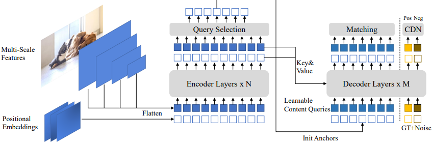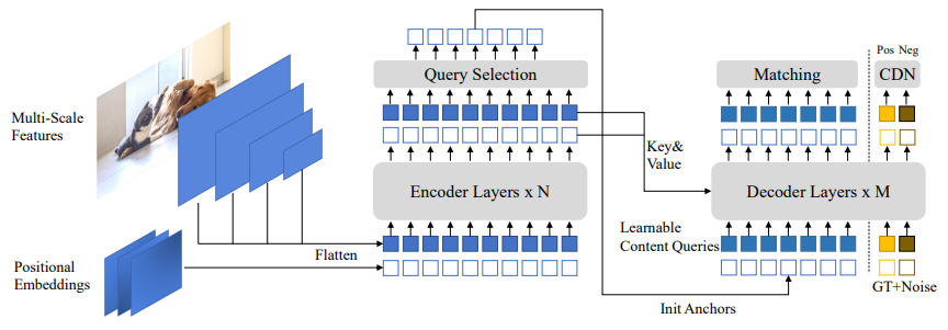 DINO는 DETR을 기본으로 DAB-DETR의 동적 앵커 박스, DN-DETR의 노이즈 제거 훈련, 그리고 deformable attention을 채택하며 또한 3가지 새로운 방법을 제안한다.