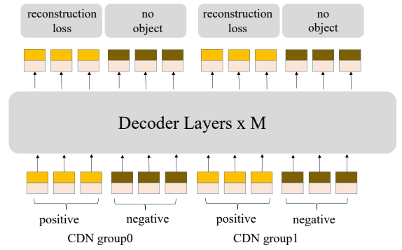 노이즈 제거 훈련은 근처에 물체가 없는 앵커에 대해서는 "물체가 없다"고 예측하는 기능이 부족하다. 따라서 contrastive denoising(CDN)을 제안한다.
