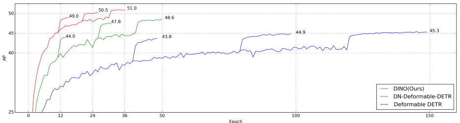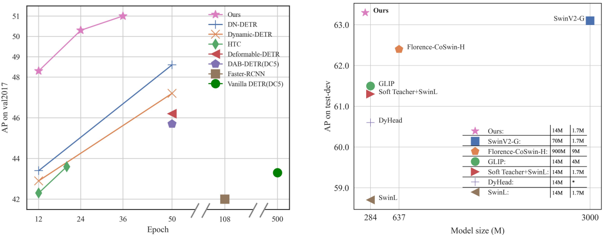 DETR의 개선 모델들인 DAB-DETR, DN-DETR, Deformable DETR을 기반으로 DINO라는 새로운 DETR 유사 모델을 설계한다. DINO는 다음 그림과 같이 매우 우수한 성능을 보여준다.