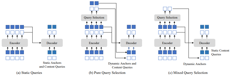 Deformable DETR에는 쿼리 선택 변형이 있는데, (b)처럼 선택된 인코더 feature에 의해 content 쿼리와 위치 쿼리가 모두 생성된다.
