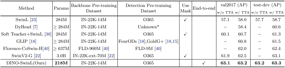 Contrastive denoising training, mixed query selection, look forward twice를 사용하는 DINO를 제안하여 성능을 크게 향상시켰다.
