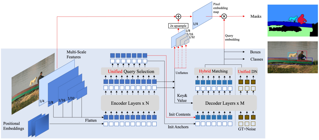 파란 박스가 DINO의 아키텍처이고, 빨간 부분이 Mask DINO에서 도입된 부분이다. (DINO의 아키텍처와 거의 같고, 이 논문 자체의 내용은 매우 짧기 때문에, detection에 관심이 있다면 DETR 개선 시리즈를 다 읽고 보는 것이 좋다.)