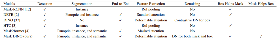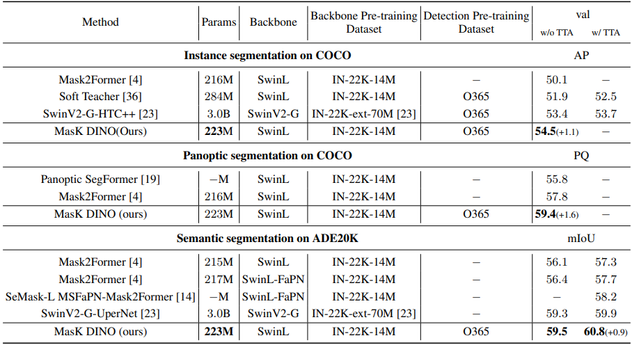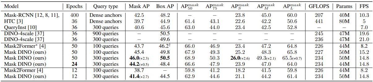 - Anchor box-guided cross attention, 쿼리 선택, denoising training, 대규모 데이터 세트에 대해 사전 훈련된 더 나은 표현 등 DINO의 개선을 자연스럽게 계승하며 object detection 및 segmentation을 위한 통합 프레임워크를 개발한다.