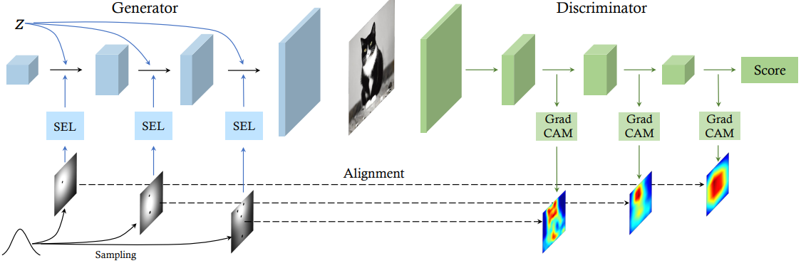 반대로 G는 공간에 대한 그 어떤 단서도 없다. 이러한 문제를 해결하기 위해 다단계 히트맵과 D에서 유도된 attention map을 활용하는 새로운 교육 방법인 EqGAN-SA (improve the Equilibrium of GAN through raising Spatial Awareness)를 제안한다.