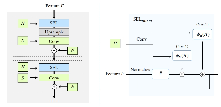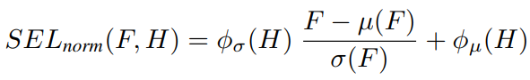SPADE(Spatially-Adaptive Denormalization)에서 영감을 받은 SELnorm은 다음과 같다.