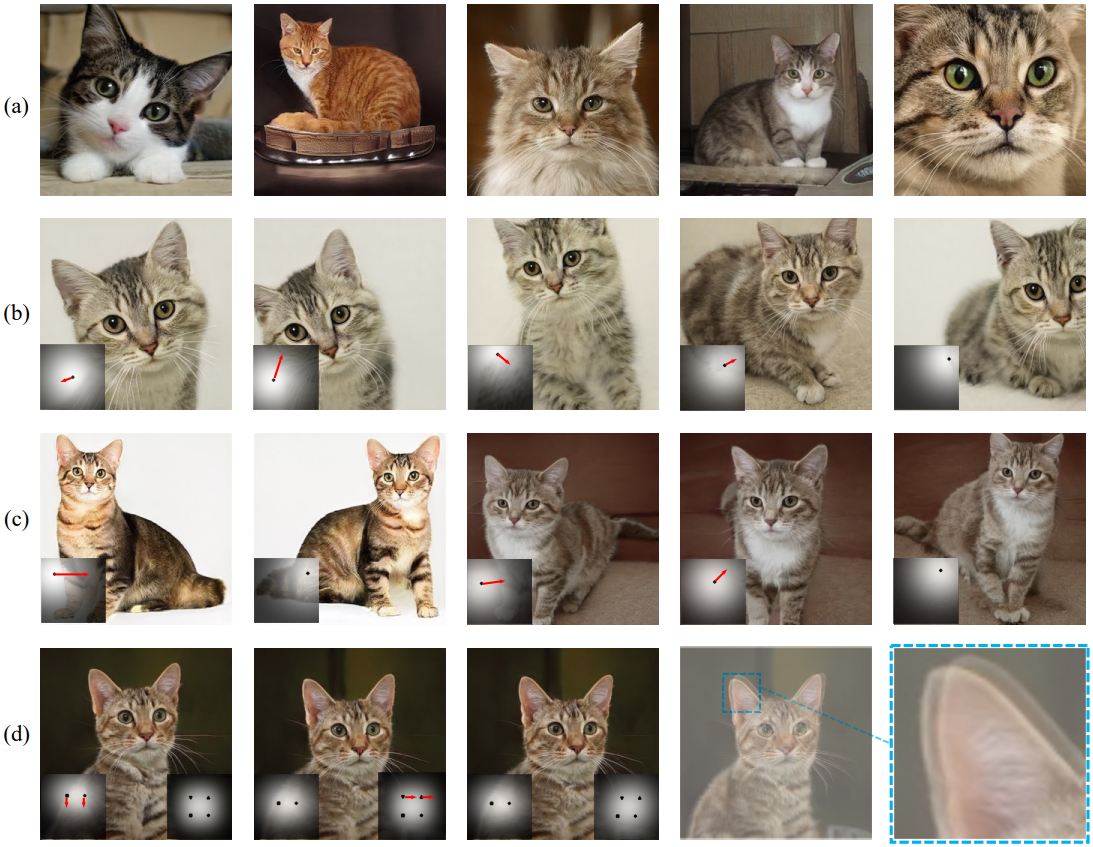 (d) 귀, 눈 등 히트맵을 훨씬 더 세부적으로 조정한다. 주목할 점은 styleGAN3에서와 같은 앨리어싱 제거 절차가 전혀 없었는데도 불구하고 equivariance 하다는 것이다!!