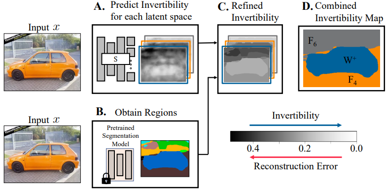 기존의 GAN 반전 및 편집 방법은 복잡한 장면과 개체 폐색으로 인해 종종 어려움을 겪는다. 본 논문에서는 GAN의 잠재 공간에서 이러한 복잡한 이미지를 반전하고 편집하는 새로운 방법을 제안한다. 핵심 아이디어는 이미지의 난이도에 따라 반전 프로세스를 공간적으로 적응시키면서 레이어 모음을 사용하여 반전을 탐색하는 것이다. 먼저 서로 다른 이미지 segment의 반전 가능성을 예측하고 각 segment를 잠재 계층으로 투영한다. 더 쉬운 영역은 G의 잠재 공간에서 더 이른 레이어로 반전될 수 있는 반면, 더 어려운 영역은 나중에 반전될 수 있다.