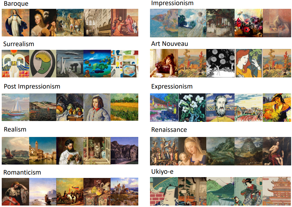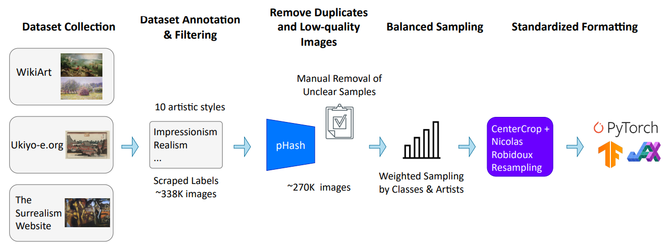 (https://Ukiyo-e.org), WikiArt(https://WikiArt.org), Surrealisum(https://surrealism.website/)에서 데이터를 수집하고 필터링, 샘플링, 표준화를 거쳤다.