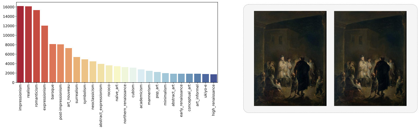 (WikiArt 데이터셋의 long-tail 분포와 중복 이미지)