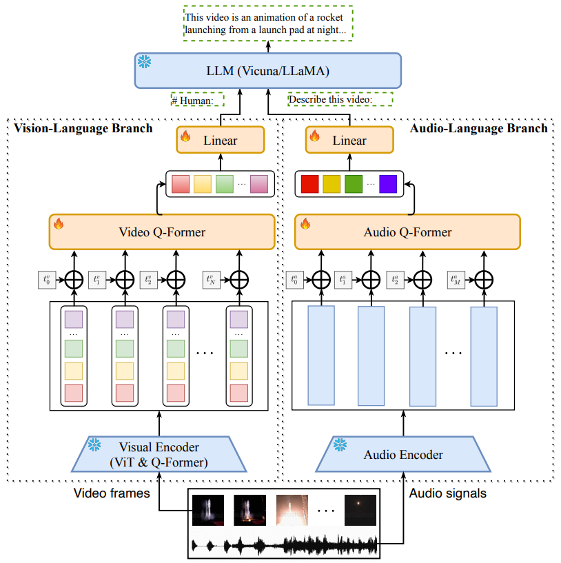 BLIP-2의 아이디어를 채택해 Video Q-former, Audio Q-former를 도입하고 multi-branch cross-model 고안.