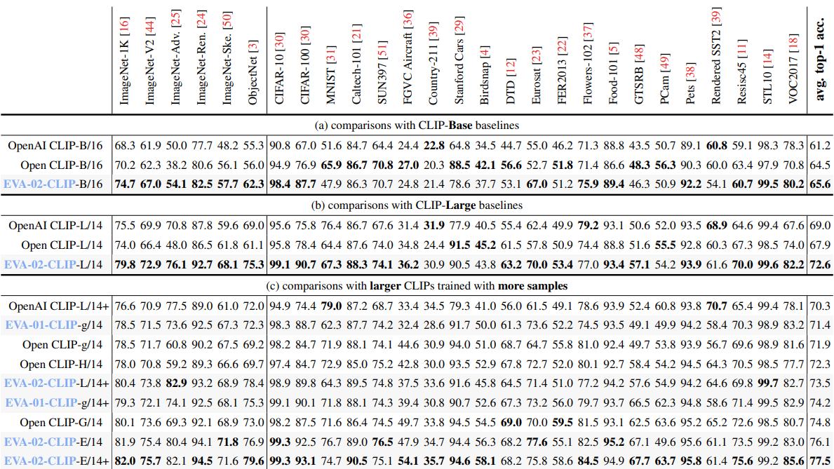 Summary of EVA-CLIP zero-shot image classification performance on 27 datasets