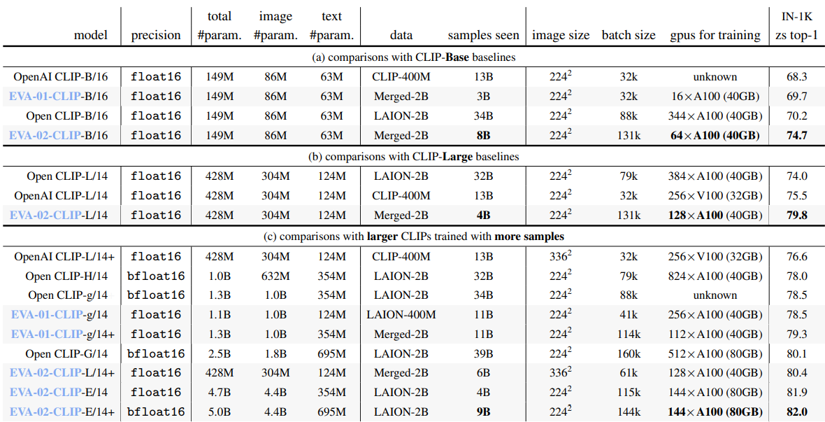 EVA-01-CLIP은 FP16 정밀도, EVA-02-CLIP은 bfloat16 형식 사용.