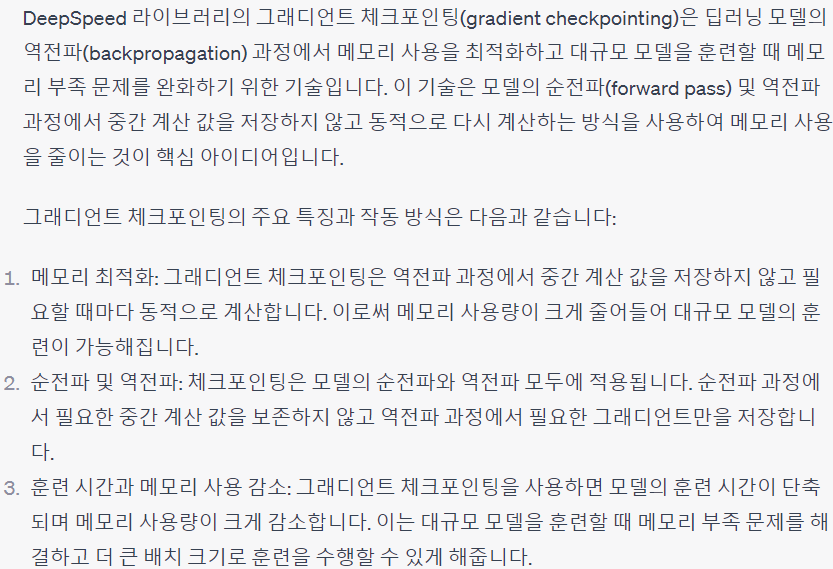 훈련 프로세스를 더욱 개선하기 위해 DeepSpeed optimization library(ZeRO stage-1 optimizer, gradient checkpointing, flash attention) 사용.