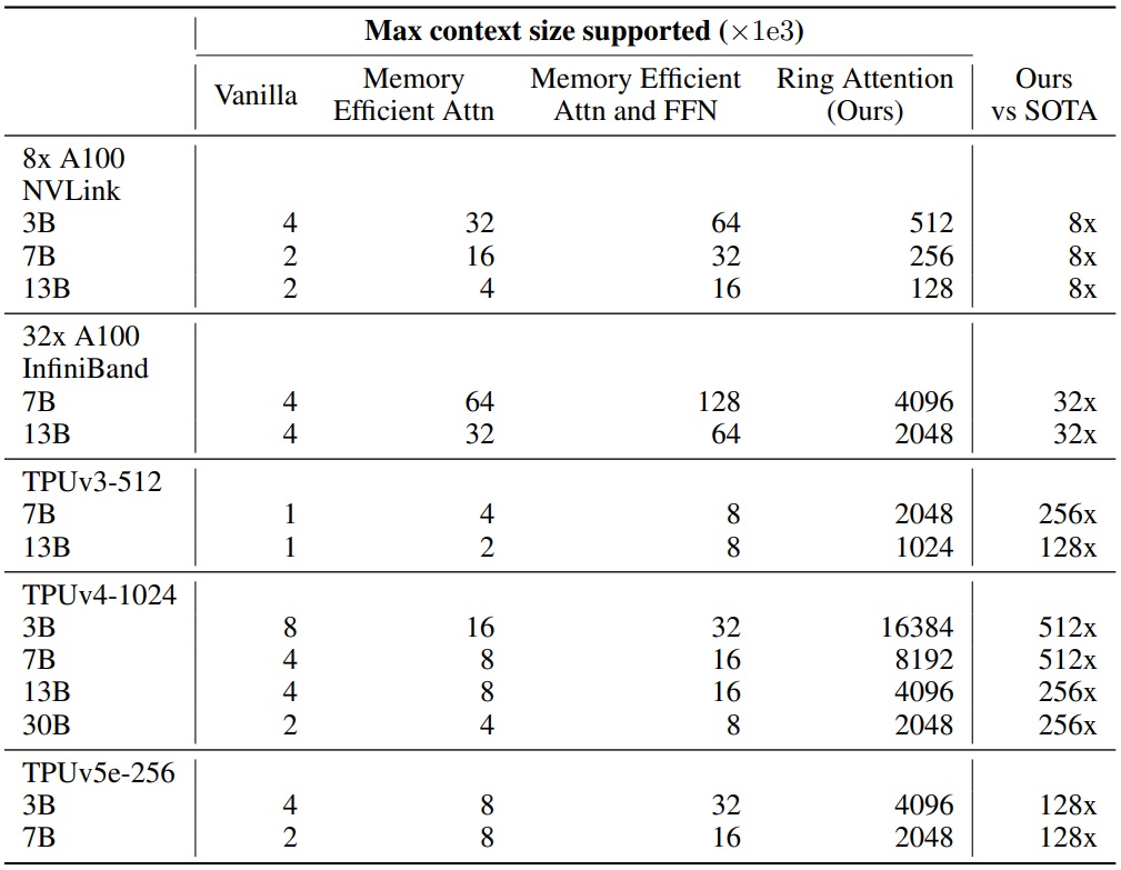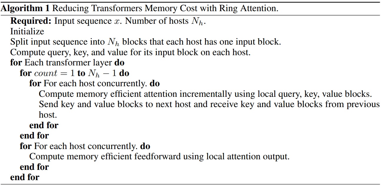 이전의 메모리 효율적인 transformers 보다 훨씬 긴 시퀀스를 훈련하고 추론할 수 있는 Ring Attention 제안