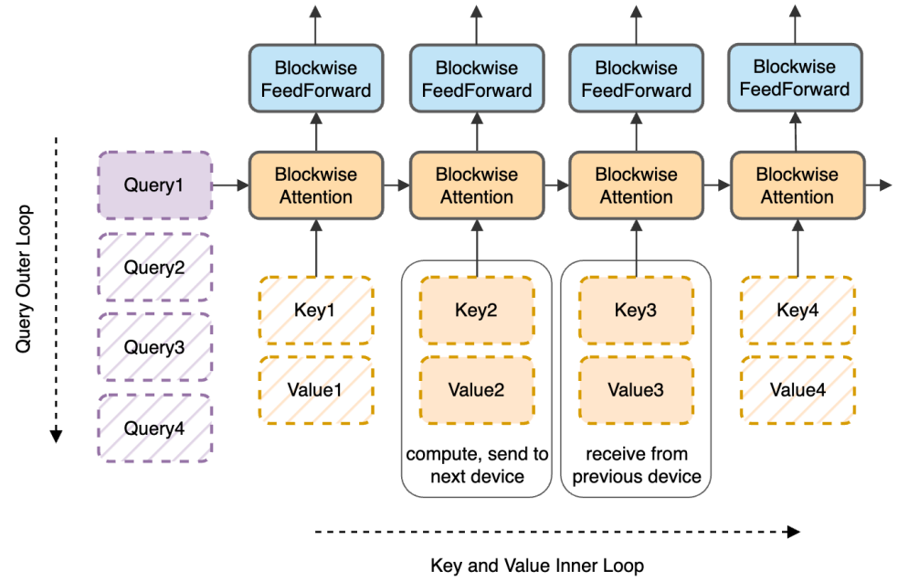 Ring Attention에서, 각 장치는 지정된 시퀀스 블록에 대한 attention, FFN을 계산한다. 각 장치는 ring을 형성하여 KV 블록을 공유한다.