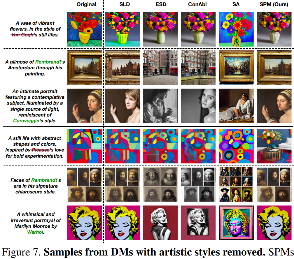 SPM은 보조적인 훈련 데이터 없이도 사전 훈련된 모델을 유지하면서 개념을 지우는 방법을 학습한다.