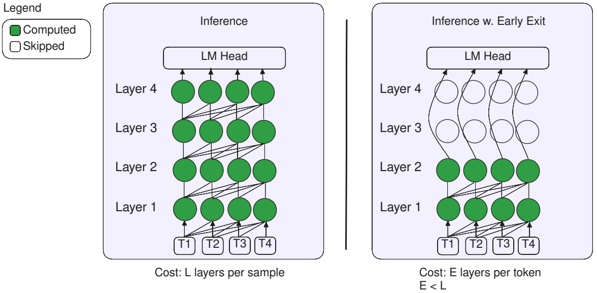 Layer dropout을 사용하여 모델이 후기 레이어보다 초기 레이어에 더 의존하도록 하고, 손실 함수를 추가하여 모델이 레이어를 건너뛰고 바로 LM head를 통해 토큰을 출력할 수 있도록 하는 방법을 제안한다.